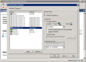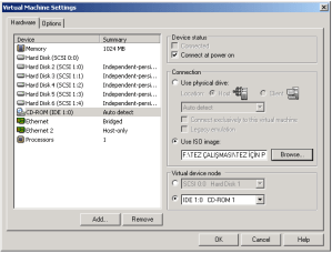 46-Kurulum esnasında diğer CD’ler de istendiğinde Vmware Server Console penceresinin en altında yer alan CD-ROM ikonundan ‘Edit’ seçeneğini tıkladığımızda karşımıza gelen ekrandan aşağıda da görüldüğü gibi diğer istenilen CD’leri seçtik ve kuruluma devam ettik.