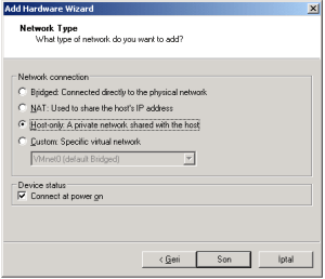 18-Burada network tiplerinden ‘Host-only:’ seçeneği ile donanımımızın Ethernet kartını kullandık.