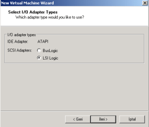 10-Giriş-Çıkış(I/O) adapter tiplerinden ‘LSI Logic’ default olarak seçili iken sonraki adıma geçildi.