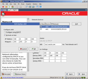 Burada public IP adresini kendi domain’imdeki bilgisayarımın IP adresi 192.0.60.53’e göre 192.0.60.166 olarak belirledim. Kendi domain IP adresinize göre bunu belirleyebilirsiniz. Birinci sanal Linux makinemizin hostname’i olarak ‘rac1.oracle.com’ adını belirledim tabi siz istediğiniz şekilde adlandırabilirsiniz.