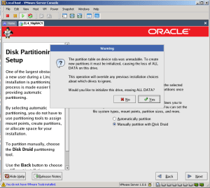36-Disk bölümleme bölümünde ‘Manually partition with Disk Druid’ seçeneği ile diski manuel olarak bölümlemeyi seçtik ve karşımıza çıkan ‘Warning’ ekranında ‘Yes’ butonuna tıkladık.