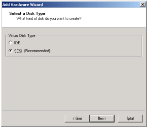 22-Sanal disk tiplerinden önerilen SCSI tipini seçip ileri butonunu tıkladık.
