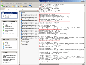 28-Bu aşamada oluşturduğumuz diskleri, VMware Konfigürasyon dosyasını (F:\My Virtual Machines\RAC\rac10g\rac1\Red Hat Enterprise Linux 4.vmx) notepad ile açarak ekledim fakat bu arada ayarların kaydedilmesi için Virtual Machine Settings ekranını kapattım. Kuracağımız Linux sistemleri tarafından disklerin ortak olarak kullanılması için aşağıda mavi renkle belirtilen kısımları ekledim;