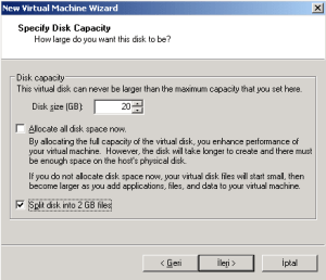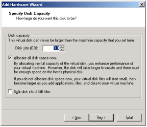 23-Her bir disk alanını ayırmak için 19. adımda gösterilen Tablo 1:’deki gibi diskleri oluşturduk. Aşağıda görüldüğü gibi ’Allocate all disk space now’ seçeneğini seçip ‘Split disk into 2 GB files’ seçeneğini kaldırdık. Disk boyutunu 3GB olarak belirledik.