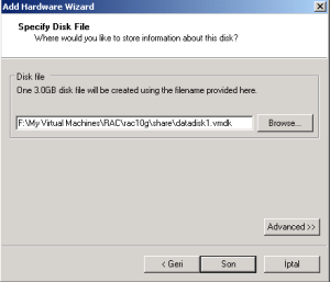 24-Diskleri ‘datadisk1.vmdk’, ’datadisk2.vmdk’, ’datadisk3.vmdk’ ,’ocrdisk. vmdk’ ve ‘votingdisk.vmdk’ şeklinde isimlendirdik. F:\My Virtual Machines\RAC\rac10g\share\ dizinine ‘datadisk1.vmdk’ diskini ‘Son’ butonuna tıklayarak oluşturduk.