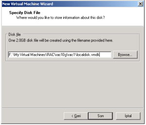 14-Sanal diskimize ‘localdisk.vmdk’ adını verdik ve bunu birinci sanal makinemizin bulunduğu dizinde (F:\My Virtual Machines\RAC\rac10g\rac1\) oluşturduk.
