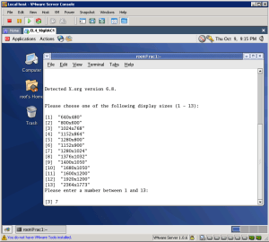 60-Root kullanıcısı ile terminal pencereyi açtık ve ‘/usr/bin/vmware-config-tools.pl’ dosyasını çalıştırarak Vmware Tools paketinin konfigürasyonunu yaptık. Kendi istediğimiz ekran çözünürlüğünü seçtik. Ben genellikle ‘1280×1024’ çözünürlüğünü kullandığımdan 7 ‘yazıp enter ile seçimimi yaptım.