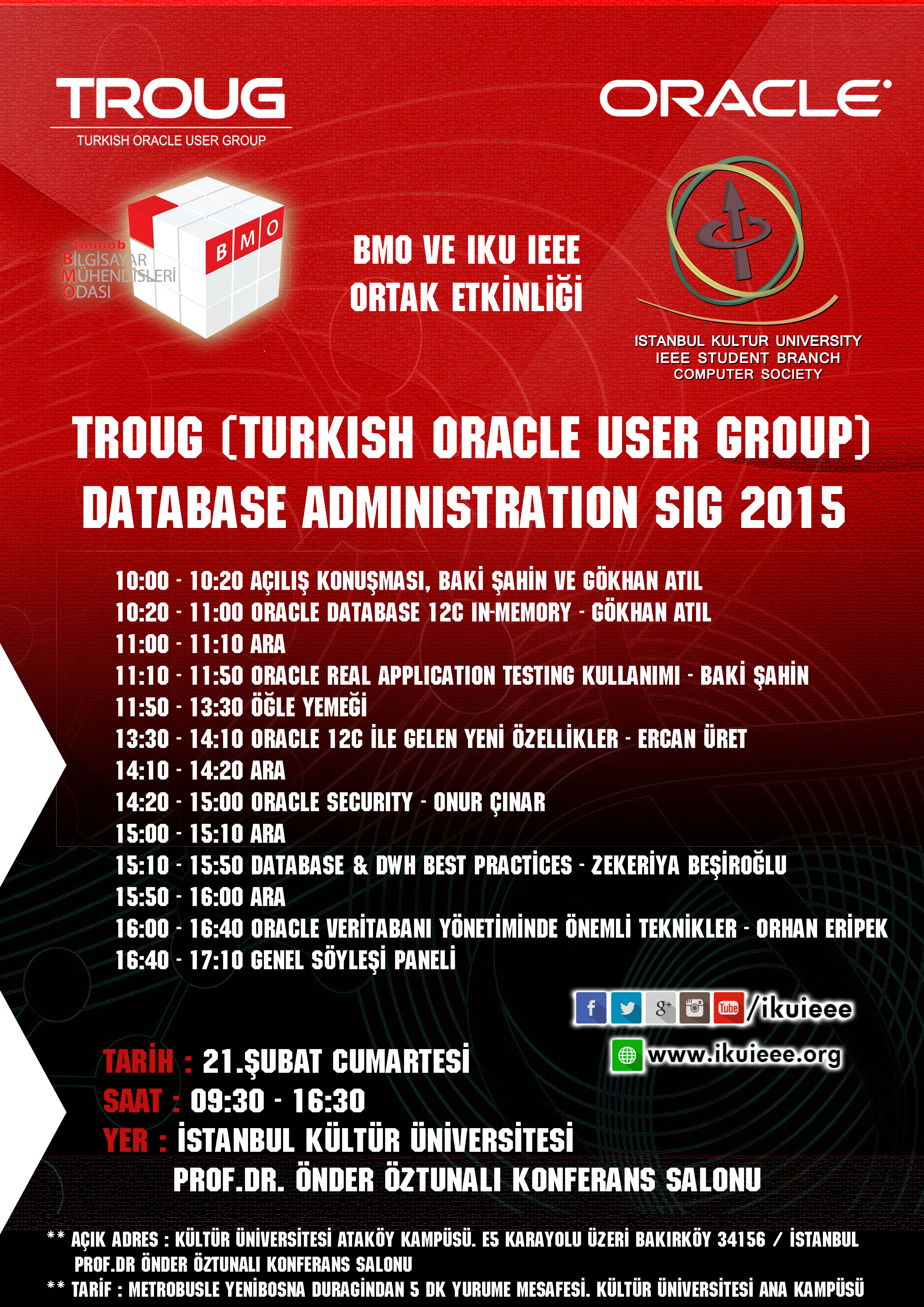 TROUG olarak “Database Administration SIG 2015” etkinliğimizde sizlere Oracle 12c ile gelen yenilikleri, Database In-Memory, Real Application Testing ve diğer teknoloji çözümlerini, veritabanı güvenliğini ve önemli yönetim tekniklerini sunmak istiyoruz. BMO ve IKU IEEE Ortak etkinliğimizde katılımcılara çekiliş ile süpriz hediyelerimiz de olacaktır. Etkinliğimiz ücretsiz olup, kayıt yaptıran herkes davetlidir.