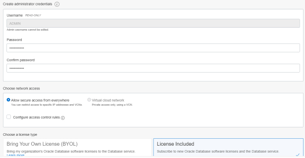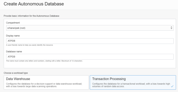default compartment “account (root)” olarak geliyor. Database ismi olarak ATPDB veriyorum, şifre belirliyorum ve “Always Free” seçeneğini seçiyorum.
