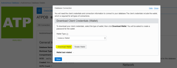 Lokalimizdeki Sql Developer uygulaması üzerinden ATPDB database’imize bağlanmak istersek öncelikle ATPDB konsolundaki “DB Connections” ekranından “Download Wallet” butonunu tıklayıp şifre belirledikten sonra wallet .zip imizi indiriyoruz.