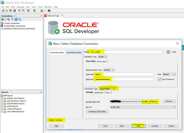 Lokalimizdeki Sql Developer uygulamasında “new connection” deyip connection ismi veriyoruz (conn_atpdb), admin/pass bilgilerini giriyoruz, connection type olarak “Cloud Wallet” ve lokaldeki “Wallet_ATPDB.zip” file’ımızı seçiyoruz. Birkaç servisi kullanarak bağlantı sağlayabiliriz, ben “atpdp_high” olanı seçiyorum ve test connection, ardından save diyorum.