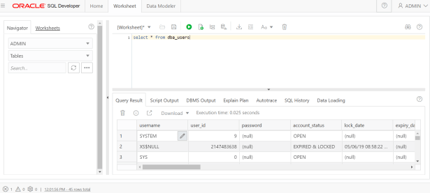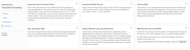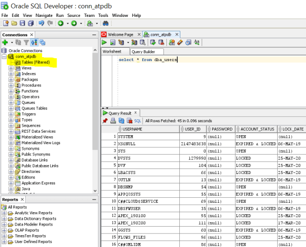Lokalimdeki Oracle Client’ın \bin folder’ına cmd ile giriyorum ve TNS_ADMIN env’ında dizinini vererek set ediyorum ve sqlplus’a “atpdb_high” servisi üzerinden admin user/pass’i ile bağlanıp tüm database işlemlerini yapabiliyorum.