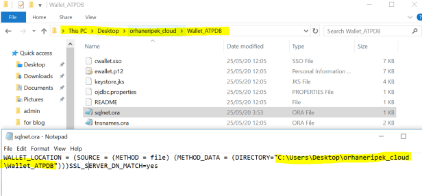 Lokalimizdeki sqlplus ile de bağlantı kurmak için; .zip file’ı açtıktan sonra sqlnet.ora file’ında directory olarak dizinin lokasyonunu yazıyorum.