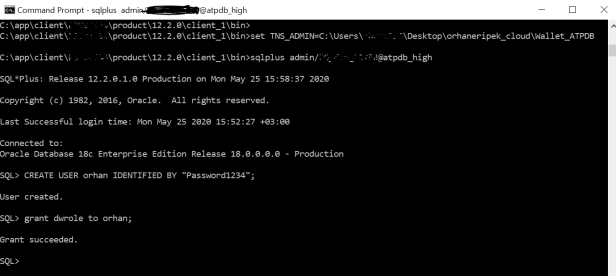 set TNS_ADMIN=C:\Users\Desktop\orhaneripek_cloud\Wallet_ATPDB sqlplus admin/****@atpdb_high CREATE USER orhan IDENTIFIED BY "Password1234"; grant dwrole to orhan;