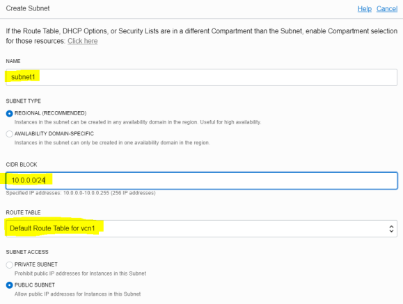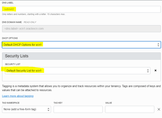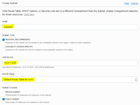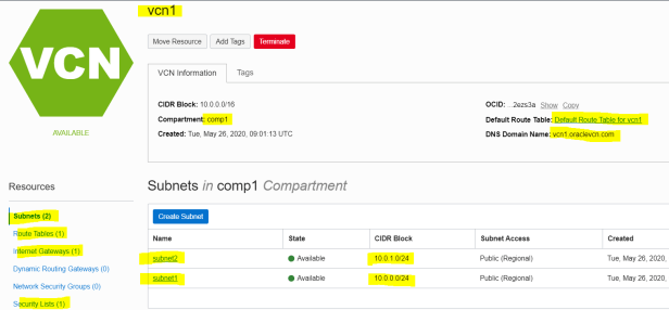 My VCN name is “vcn1”. I chose my “comp1” compartment. I have set a sample CIDR. I created subnets under the names subnet1 and subnet2 and selected default DHCP, route table and default security list.