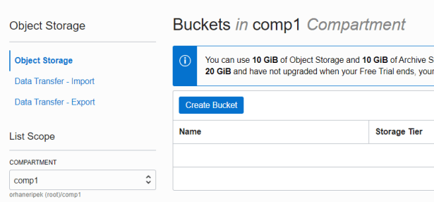 Let’s look at how to transfer data from our bucket in Object Storage to the tables under the sample schema in our Autonomous database. To do this, we first need to create a bucket.
