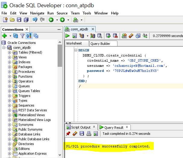 BEGIN DBMS_CLOUD.drop_credential(credential_name => 'OBJ_STORE_CRED'); END; / BEGIN DBMS_CLOUD.create_credential ( credential_name => 'OBJ_STORE_CRED', username => 'orhaneripek@hotmail.com', password => '78PJL#wEw0uM7hzlrPX8' ) ; END; /