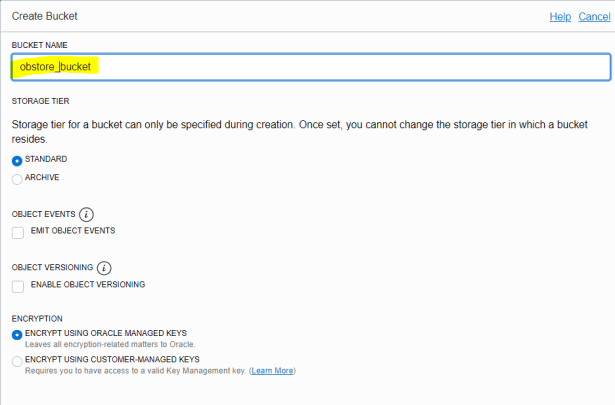 Object Storage -> Create Bucket